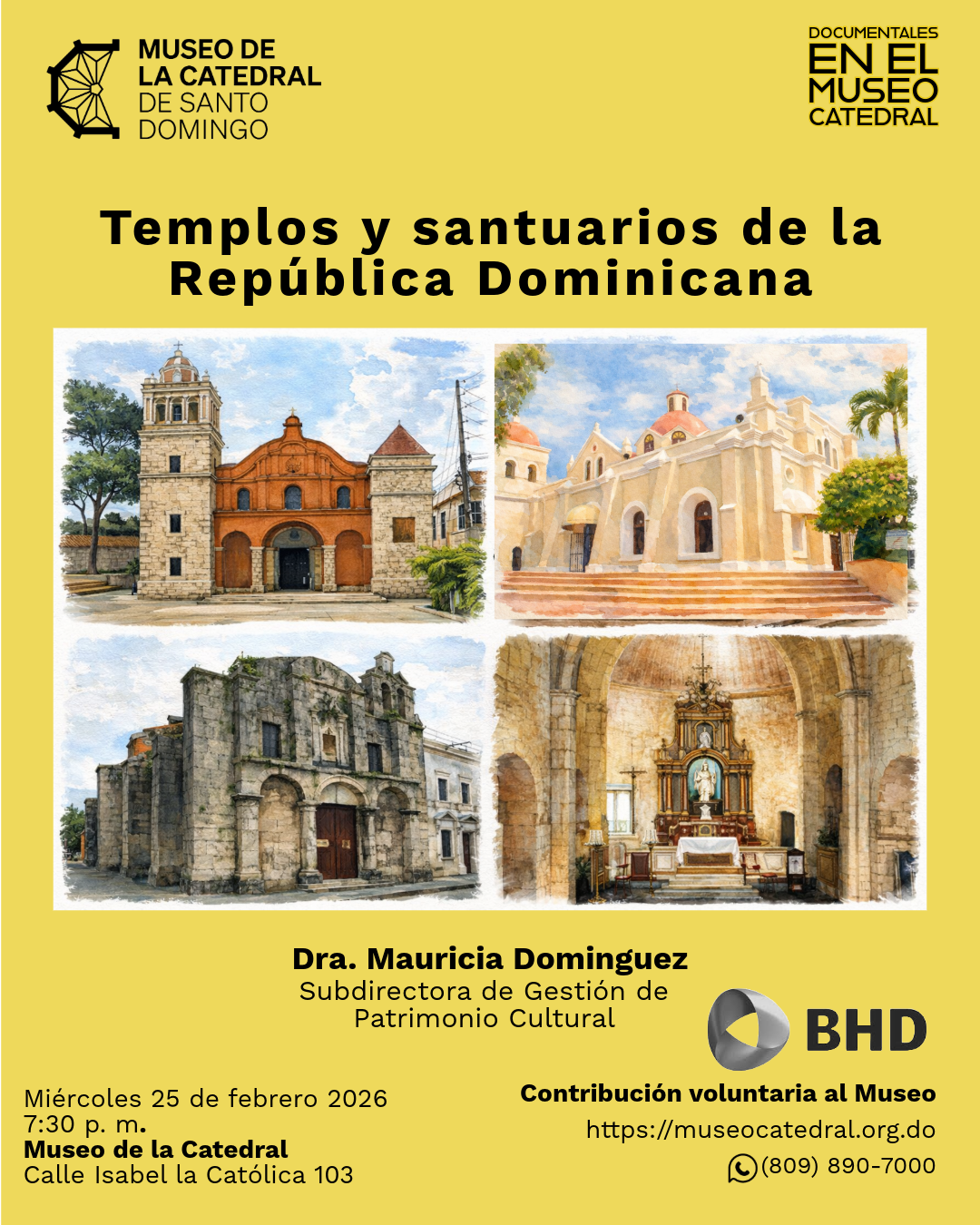 Te invitamos a una noche de historia y cultura en el Museo de la Catedral . Disfrutaremos del documental «Templos y santuarios de la República Dominicana» , impartido por la Dra. Mauricia Domínguez .