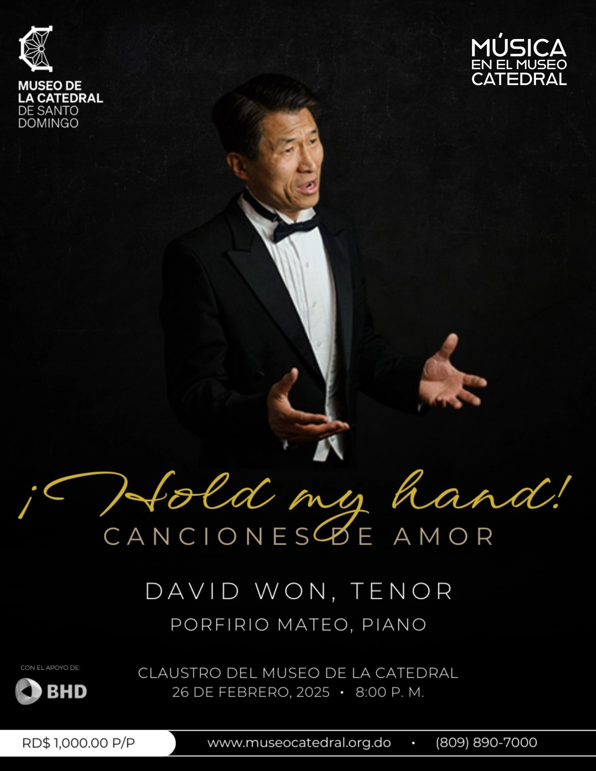 Artistas de Talla Mundial: Disfruta del talento del reconocido tenor David Won , quien ha recorrido escenarios desde Boston hasta Ucrania y Corea del Sur..Lo acompaña el virtuoso pianista dominicano Porfirio Mateo , colaborador de figuras como Plácido Domingo y Andrea Bocelli.